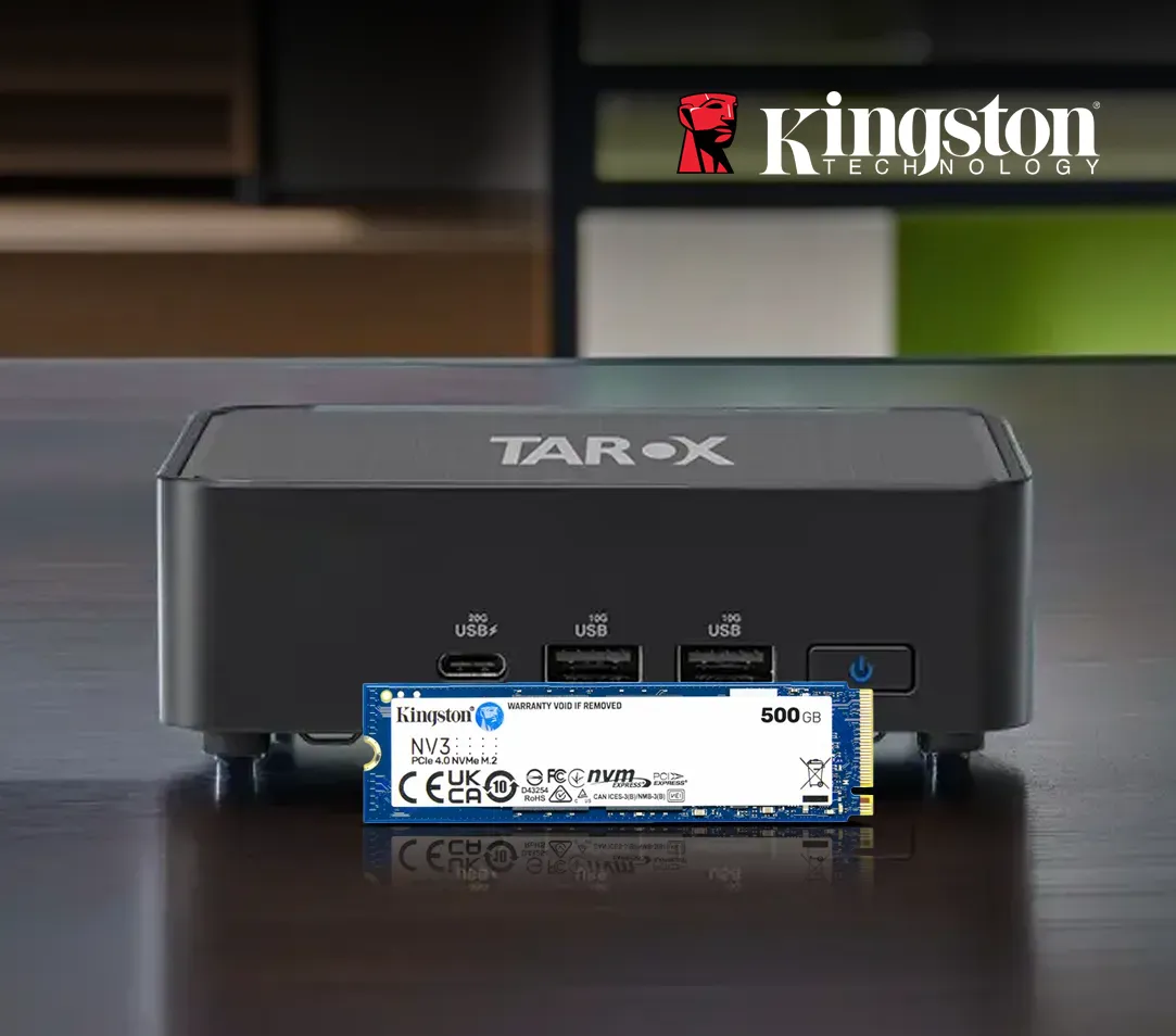 Die intergierte Kingston NV3 ist eine kompakte M.2 PCIe 4.0 SSD mit bis zu 4 TB Speicher. Sie bietet schnelle Lese-/Schreibraten bis 3.500/2.800 MB/s, arbeitet energieeffizient und bleibt kühl. Einfach ideal im TAROX MINI PC G14 SE.