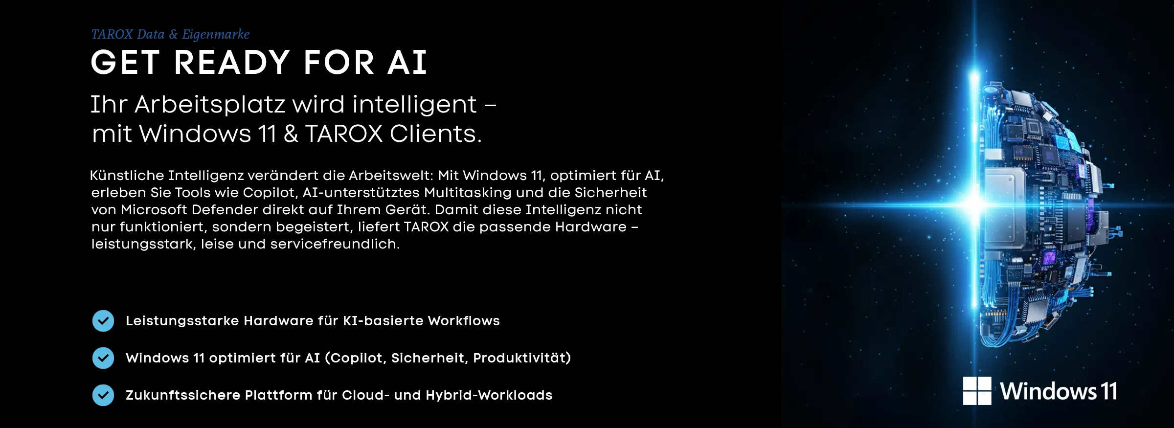 Mit Windows 11 wird KI alltäglich: Copilot, intelligente Workflows, höhere Sicherheit, optimiertes Multitasking. Doch echte AI-Performance entsteht erst mit der passenden Hardware. TAROX Clients bieten die Power, Effizienz und Sicherheit, die moderne Arbeitsplätze brauchen.