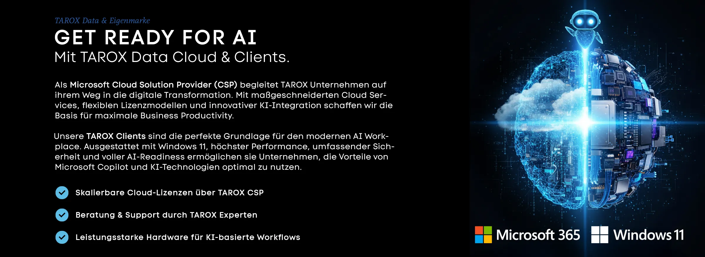 Unternehmen, die jetzt handeln, schaffen Wettbewerbsvorteile, Effizienzgewinne und nachhaltige Sicherheit. Mit TAROX erhalten Sie die perfekte Kombination aus Cloud-Intelligenz und Hardware-Power für die neue Arbeitswelt. Gemeinsam machen wir Ihre IT AI-ready – einfach, sicher und leistungsstark.