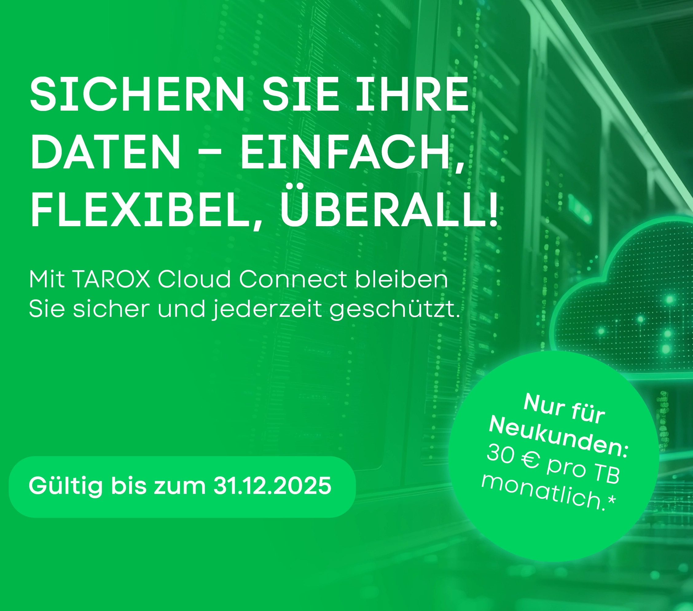 Nur für Neukunden: Statt 50 € zahlen Sie bis zum 31.12.2025 nur 30 € pro TB/Monat. Nutzen Sie jetzt die Gelegenheit und testen Sie 30 Tage lang die Vorteile von TAROX Cloud Connect – flexibel, sicher und wirtschaftlich.